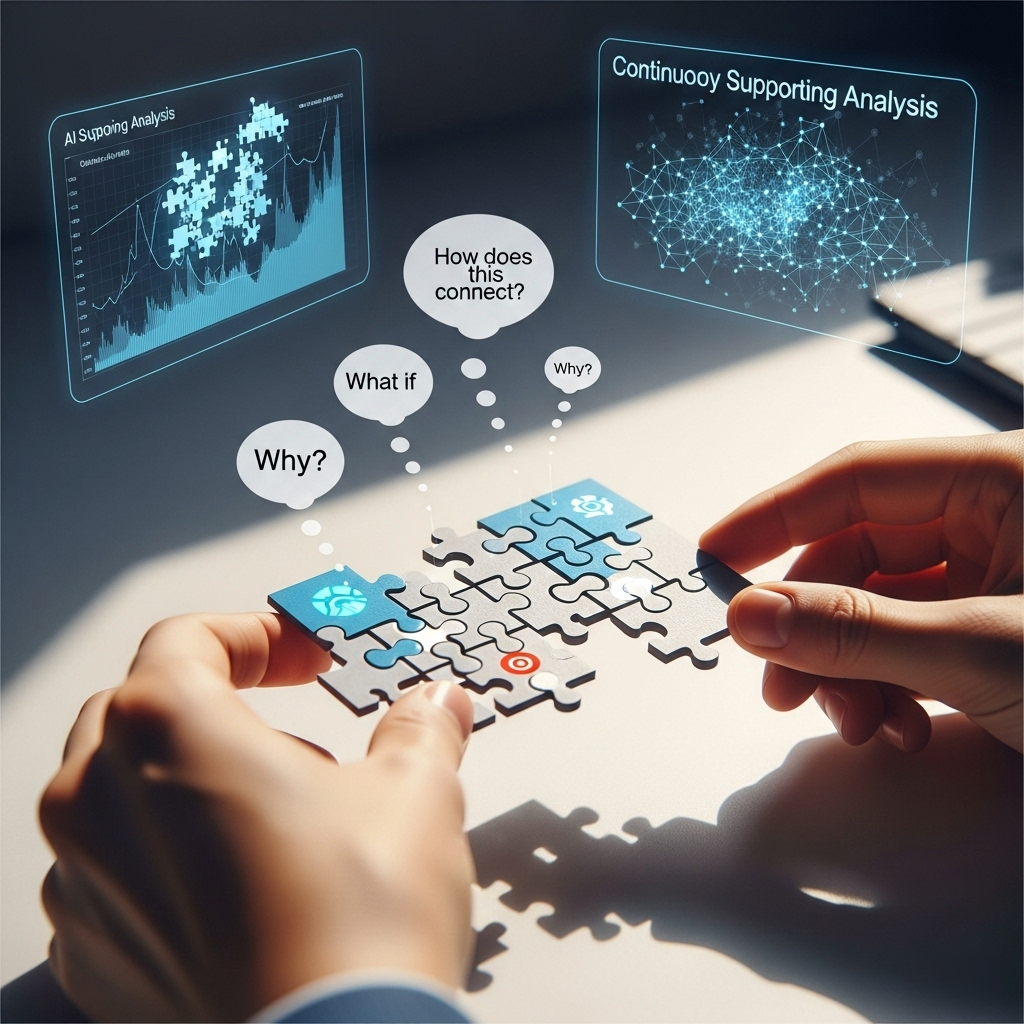 [IMAGE: A puzzle with pieces representing different data points being assembled by human hands, while AI provides supporting analysis in the background. Include thought bubbles showing questions like “Why?” “What if?” “How does this connect?” Style: analytical, problem-solving focus, bright lighting.]